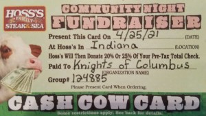 Be sure to get your Cash Cow Card from any member of the Knights and we’re asking all Brother Knights to invite your family, friends, co-workers to Hoss’s Steak & Sea House in Indiana. One card is good for the entire table and it runs all day.